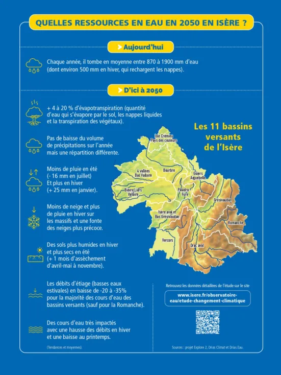 Des projections ont été établies au niveau des onze bassins versants isérois en termes d’évolution de la ressource en eau (débit des cours d’eau, évolution des précipitations, humidité des sols, stockage de l’eau sous forme de neige, etc.), sous la supervision d’un comité scientifique regroupant des experts de l’Inrae, de l’Université Grenoble Alpes, de Météo-France et d’EDF.