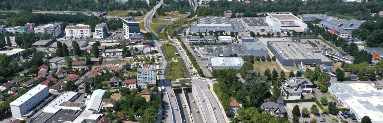 La tranchée couverte est un ouvrage souterrain, permettant une intégration discrète. À l’Ouest, une passerelle pour les modes actifs permettra la traversée de l’A480 avec un raccordement sur les itinéraires cyclables qui maillent le projet en surface. Celui-ci accueille également des arrêts de bus sécurisés.