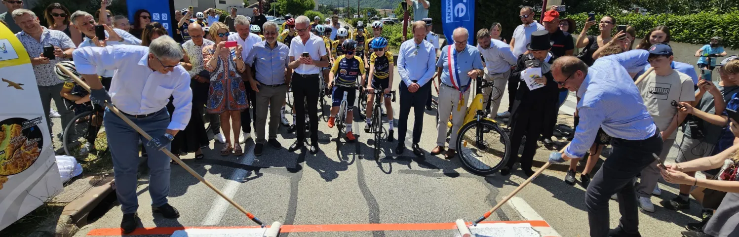 Le Président du Département Jean-Pierre Barbier et le Directeur du Tour de France Christian Prudhomme, accompagnés des Vice-présidents Martine Kohly, chargée des sports, et Christophe Suszylo, chargé du tourisme et de l’attractivité, et du Conseiller départemental Michel Doffagne ont tracé la ligne de départ de la 18ème étape de la Grande Boucle, qui se déroulera à Vif le 24 juillet prochain. Pour sa 112ème édition, l’organisateur ASO a une nouvelle fois choisi l’Isère pour faire partir une des étapes reines de la course ! Etaient également présents le représentant de Grenoble Alpes Métropole et Président du SMMAG, Sylvain Laval, le Maire de Vif, Guy Genêt, et Bernard Thévenet, Directeur du Tour Auvergne-Rhône-Alpes.