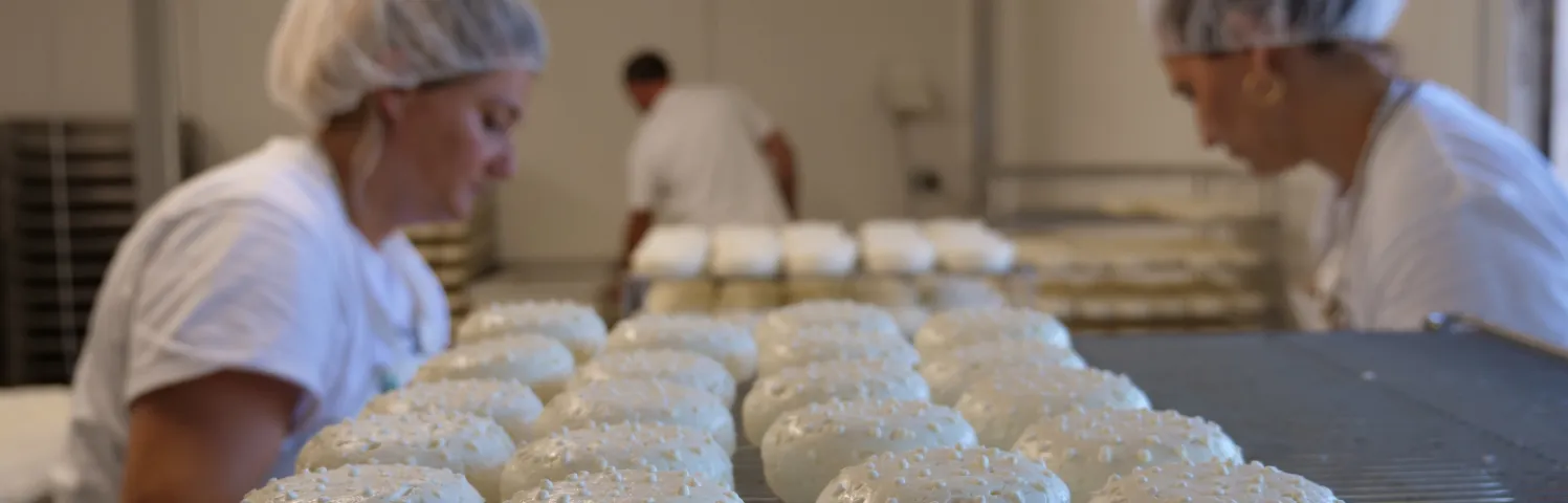 À commencer par l’emprésurage et le caillage du lait, au tout début du processus, puis le moulage, qui s’effectue en moules individuels et manuellement. « C’est là qu’on va donner sa forme ronde caractéristique au fromage et son poids, 80 grammes », glisse Mathieu Ezingeard.