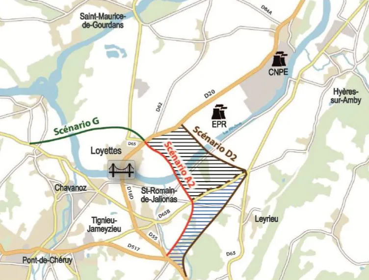A l’appui de ces études, 3 scénarios se démarquent à proximité du pont de Loyettes, assurant les meilleures liaisons directes entre le nord-Isère et les secteurs de l’EPR2 et de la plaine de l’Ain :