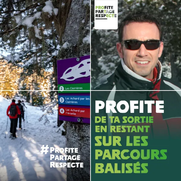 “Profite, Partage, Respecte” repose sur trois principes qui encouragent les usagers à profiter de la nature et de la montagne sans laisser de trace, à partager les sentiers et à respecter la faune dans leur milieu naturel sans les déranger.