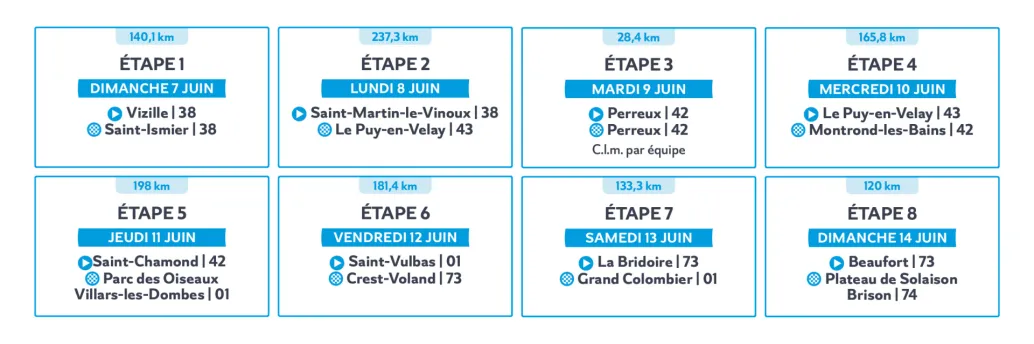 Entre Vizille, associée à la mémoire de Thierry Claveyrolat, et Saint-Ismier, où réside Bernard Thévenet, la première étape saluera deux icônes du cyclisme français. Avec trois difficultés dans les 40 derniers kilomètres, les pourcentages de la côte de Saint-Jean-le-Vieux (5,6 km à 8,7%) seront le dernier tremplin vers le premier maillot jaune et bleu, avant d’affronter une étape marathon en direction du Puy-en-Velay (237,3 km). Là encore, deux ascensions dans le final permettront de secouer le peloton. Les sprinteurs tenteront ensuite de maîtriser la course pour s’expliquer à Montrond-les-Bains (4e étape) et au Parc des Oiseaux de Villars-les-Dombes (5e étape), dix ans après la victoire de Mark Cavendish au même endroit, pour son 30e succès sur le Tour de France.