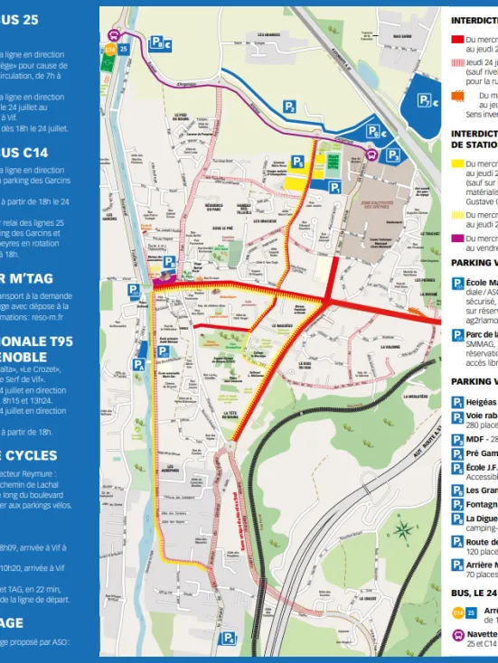 Pour faciliter votre venue à Vif, un plan détaillé vous guide dans le choix des zones de stationnement et des itinéraires de circulation. Plusieurs parkings seront mis à disposition autour du centre-ville.