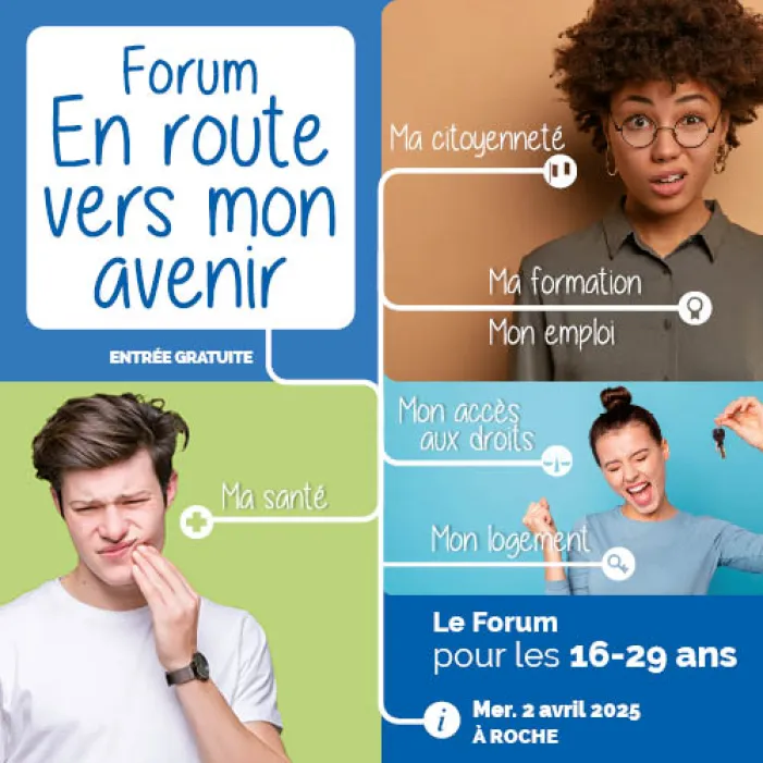 Vous avez entre 16 et 29 ans et vous vous interrogez sur votre avenir ? Le forum En route vers mon avenir vous est proposé pour vous accompagner dans vos démarches. Rendez-vous le mercredi 2 avril 2025 à partir de 10 h à la Salle de l'Arche à Roche.