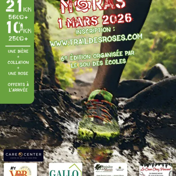 Le Trail des Roses revient pour sa 6e édition ! Beaux parcours, superbes points de vue et ambiance conviviale. Course solidaire organisée par le Sou des écoles de Moras pour financer un séjour scolaire. Rose, boisson et collation à l’arrivée !
