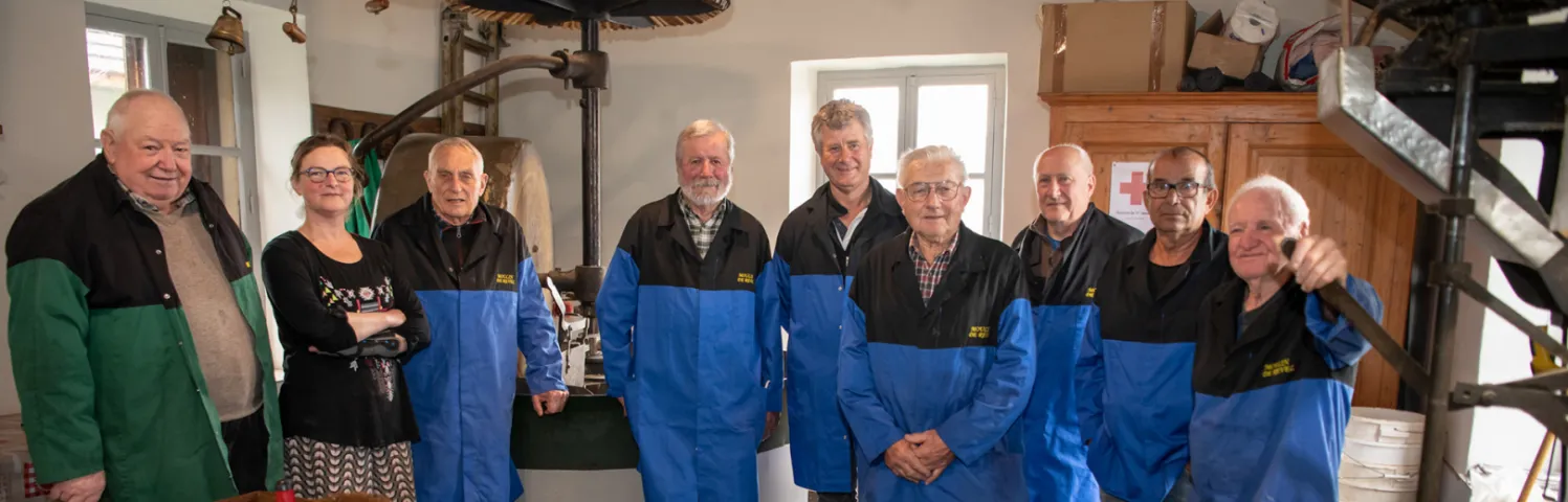 “La meule, la poêle à chauffer la pâte, et le double pressoir alimenté par une pompe à eau unique équipaient initialement le moulin de Domène. À son arrêt, en 1920, les paysans des Balcons de Belledonne ont racheté les équipements et les ont transférés dans un bâtiment communal construit en 1927 à cet effet”, rappelle Philippe Desbuisson, président de l’APPAR.