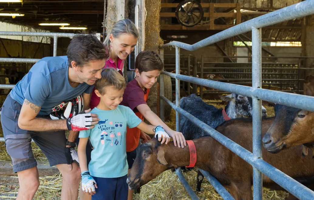 Tout au long du circuit, des haltes signalées par des flèches vertes sont proposées. À chaque étape, des panneaux donnent des indications sur la géologie, l’histoire et la richesse du lieu. La petite famille s’arrête à la ferme du Plantimay, où Benoît, Sylvain, Pascale et Claude Francillon élèvent des chèvres Sanaen et des vaches montbéliardes depuis quatre générations.